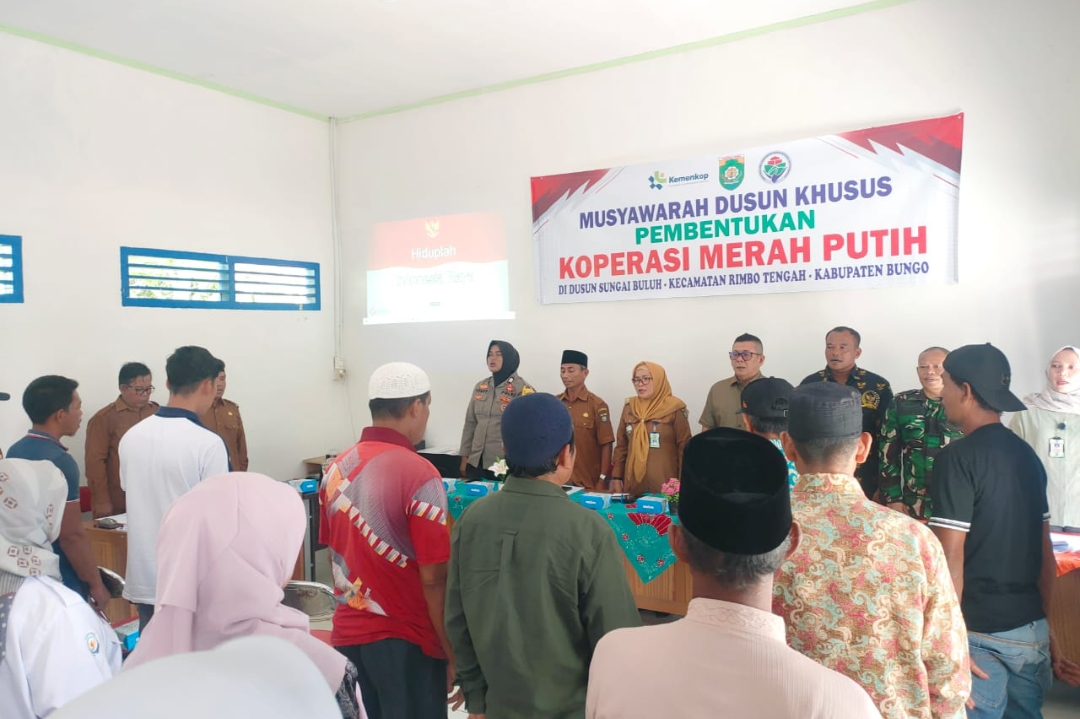 Jambipancuranpost.com.Bungo – Sebagai bagian dari implementasi Instruksi Presiden Nomor 9 Tahun 2025 tentang Percepatan Pembentukan Koperasi Desa Merah Putih, Pemerintah Dusun Sungai Buluh Kecamatan Rimbo Tengah Kabupaten Bungo provinsi Jambi Sukses melaksanakan kegiatan sosialisasi sekaligus musyawarah Desa (Musdes) Khusus dalam rangka pembentukan Koperasi Desa Merah Putih pada Senin 26 Mei 2025 bertempat di aula kantor Rio Dusun Sungai Buluh