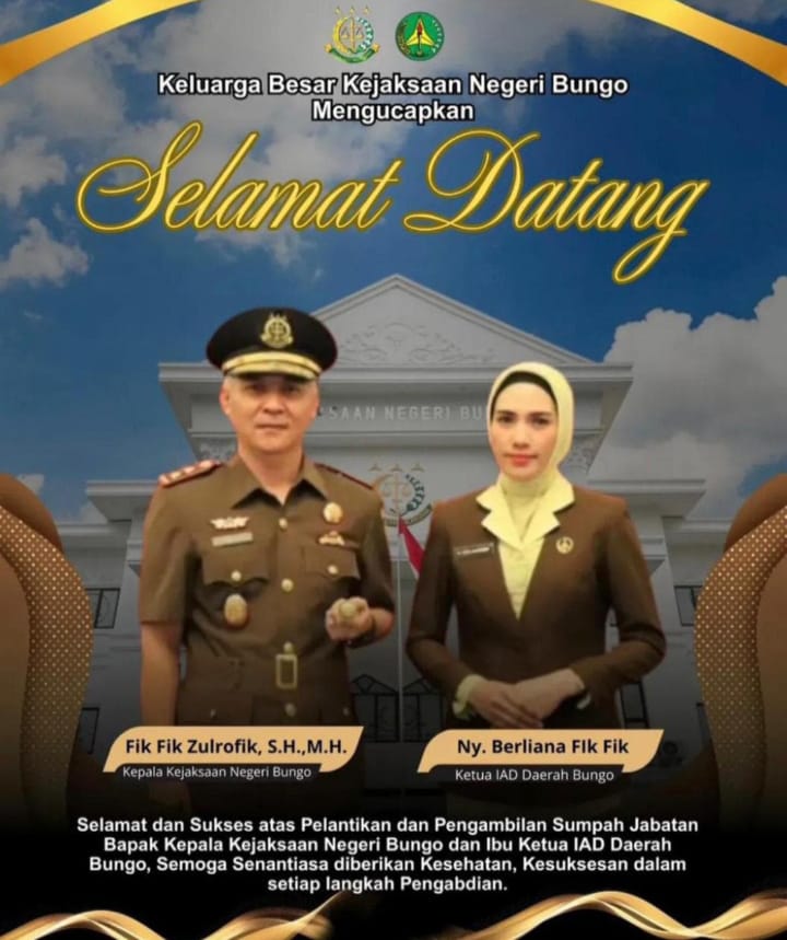 Jambipancuranpost.com.Bungo – Keluarga besar Kejaksaan Negeri (Kejari) Bungo menyampaikan ucapan selamat datang serta selamat dan sukses atas pelantikan dan pengambilan sumpah jabatan Bapak Fik Fik Zulrofik, S.H., M.H. sebagai Kepala Kejaksaan Negeri Bungo, serta Ny. Berliana Fik Fik sebagai Ketua Ikatan Adhyaksa Dharmakarini (IAD) Daerah Bungo